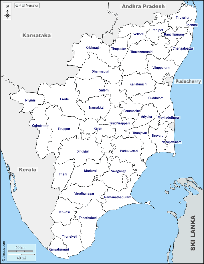 • Location: Tamil Nadu is located in the southern part of India, bordered by Kerala to the west, Karnataka to the northwest, Andhra Pradesh to the north, and the Indian Ocean to the east and south.